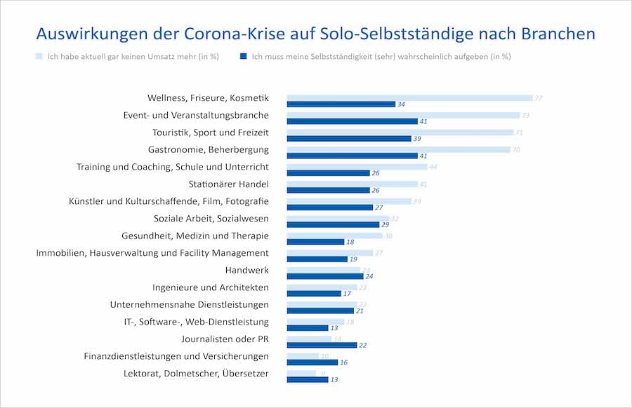 Während Solo-Selbstständige im IT-Bereich, Lektorat und Übersetzung noch halbwegs zuversichtlich sind, durch die Krise zu kommen, trifft es diejenigen in Kultur, Touristik sowie der Event- und Veranstaltungsbranche umso härter. Die Absage von Veranstaltungen ist neben dem generellen Rückgang an Aufträgen das, was Solo-Selbstständigen am meisten zu schaffen macht. Unter hohen Umsatzeinbrüchen leiden fast alle, 35 Prozent der Umfrageteilnehmer haben gar keinen Umsatz mehr. Jeder Vierte geht davon aus, seine Selbstständigkeit beenden zu müssen.