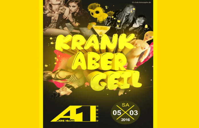 TRIER. Der Musikpark A1 feiert am Wochenende so richtig. „Krank, aber geil“-Party am Samstag am 5. März. Ab 22 Uhr ist Einlass, Eintritt kostet euch 7 Euro.