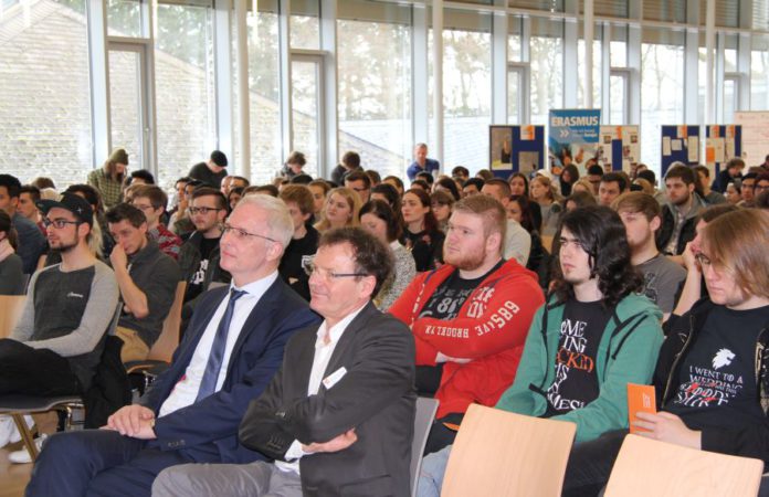 Der Präsident der Hochschule, Prof. Dr. Norbert Kuhn, begrüßte die „Erstis“ aufs Herzlichste: „Ich freue mich, Sie heute alle an der Hochschule Trier willkommen zu heißen.“ Er gab den Erstsemesterstudierenden einen prägnanten Überblick über die Hochschule. Im Anschluss richtete der Oberbürgermeister der Stadt Trier, Wolfram Leibe, ein lockeres Grußwort an die Studierenden und betonte die Wichtigkeit der Studierenden für die Stadt Trier. Herr Leibe zeigte u.a. die Vorzüge der Stadt Trier auf und gab einen Ausblick auf die wichtigsten kommenden Veranstaltungen.