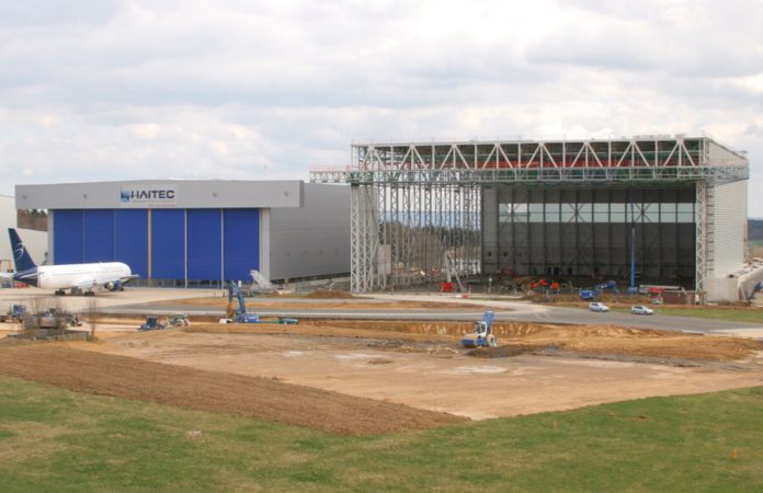 Fluggäste, die derzeit am Hahn starten oder landen, sehen sie bereits aus der Luft: Auf 17.000 Quadratmetern baut der Flughafen Frankfurt-Hahn gerade ein neues Vorfeld. Auch der Grund für die Großbaustelle ist bereits gut zu erkennen: Der Bau des neuen Hangars der Flugzeugwartungsfirma HAITEC Aircraft Maintenance GmbH ist bereits weit fortgeschritten. Die Stahlkonstruktion steht, das Dach ist gedeckt. Derzeit werden die Seitenwände verkleidet.
