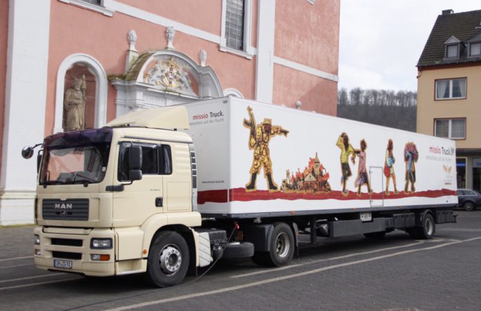 JÜNKERATH/RAPPWEILER/TRIER. Zwölf Tonnen schwer und 20 Meter lang ist das Bildungsmedium des katholischen Hilfswerks missio. Der Truck in Form eines Infomobils kommt im April ins Bistum Trier.
