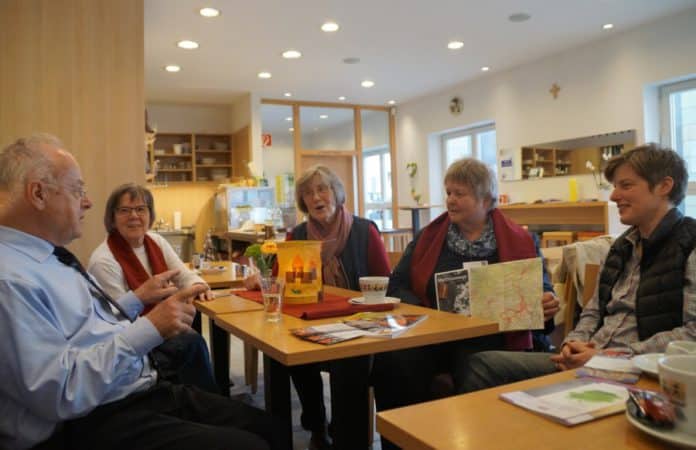 Interessiert schauen sich Doris Wiegand und Edith Hein eine Karte der Martinswege im Bistum Rottenburg-Stuttgart an, die Barbara Gitzinger mitgebracht hat. „Ab Sommer wird es auf der Web-Seite der Martinsgemeinschaft einen Überblick über den gesamten europäischen Kulturweg geben, der im ungarischen Szomathely, der Heimatstadt des Heiligen Martin, beginnt und bis nach Tours führt.“ Von Bingen bis Wasserbillig geht die Mittelroute durch das Bistum Trier und führt zu historischen Martinsorten, an denen der Bischof von Tours vor über 1600 Jahren verweilte. Das Erzählcafé zu St. Martin im Café Basilika neben der Konstantin-Basilika ist während der Heilig-Rock-Tage vom 8. bis 17. April von Dienstag bis Samstag jeweils zwischen 14 und 16 Uhr geöffnet. Informationen über das Martinsjahr im Bistum Trier gibt es unter www.martinsjahr.bistum-trier.de