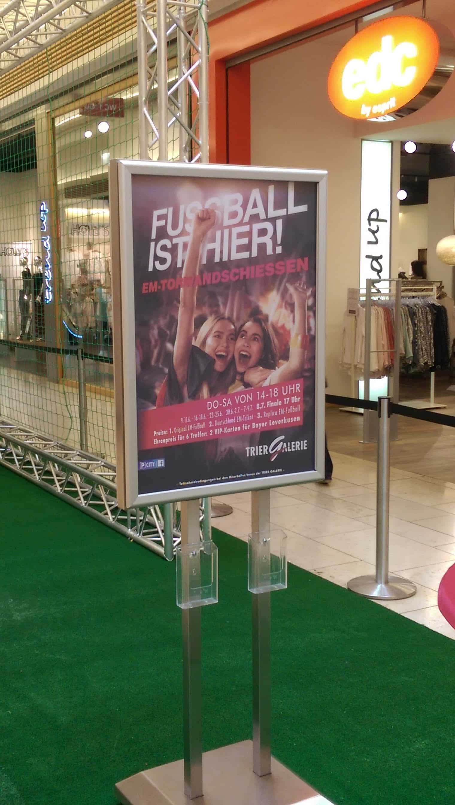 Besucher der TRIER GALERIE erleben die Fußball-Europameisterschaft unter anderem mit Tischkickern und Torwandschießen im Basement. Wer hat nicht schonmal am Samstagabend das Sportstudio geschaut und gesagt: „Ich würde alle sechs Schüsse treffen.“ Dann habt ihr die Möglichkeit dazu. Kommt von Donnerstag bis Samstag zwischen 14 und 18 Uhr vorbei und zeigt, was ihr drauf habt. Dem Gewinner winken attraktive Preise! Es lohnt sich definitiv.