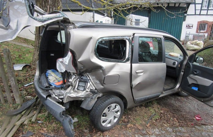 Bei dem Aufprall wurde der Dacia so massiv herumgeschleudert, dass hierdurch ein Zaunpfosten aus dem Erdreich herausgerissen und der anhängende Zaun massiv beschädigt wurde.
