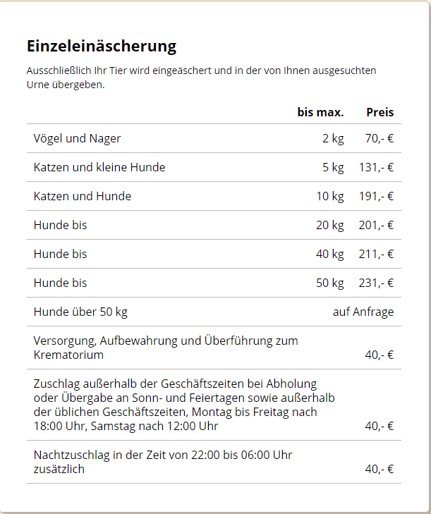 Eine preisliche Übersicht über die Kosten einer Einzeläscherung für ein geliebtes Haustier findet sich auf der Webseite des Unternehmers (REGENBOGEN Tierbestattung):