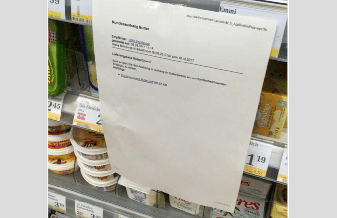Eigentlich sollte der Mitarbeiter eines Supermarktes die Kunden darauf hinweisen, dass die Butter derzeit knapp sei. Hierzu erhielt er eine Mail des Chefs mit einem „Anhang“ der ausgedruckt und aufgehangen werden sollte.