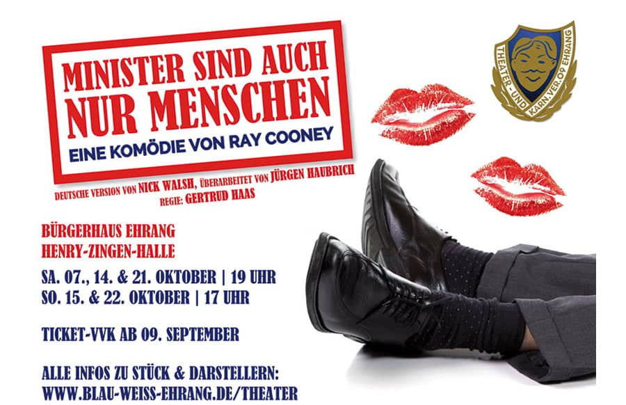 TRIER-EHRANG. „Minister sind auch nur Menschen“ heißt es ab 7. Oktober auf der Theaterbühne in der Henry-Zingen-Halle des Bürgerhauses Ehrang. Der Theater- und Karnevalsverein „Blau-Weiß“ 09 Ehrang lädt wieder zu einer turbulenten Komödie an 5 Terminen ein.