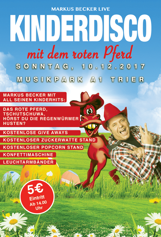 Mit dabei bei der gigantischen Party ist MARKUS BECKER der mit seinen Hits ( Unter anderem: „Das Rote Pferd“ und „Tschu Tschu Wa“) den kleinen Gästen ordentlich einheizt und für tolle Stimmung sorgt! Neben garantiert guter Stimmung gibt es an diesem Tag zahlreiche Specials!
