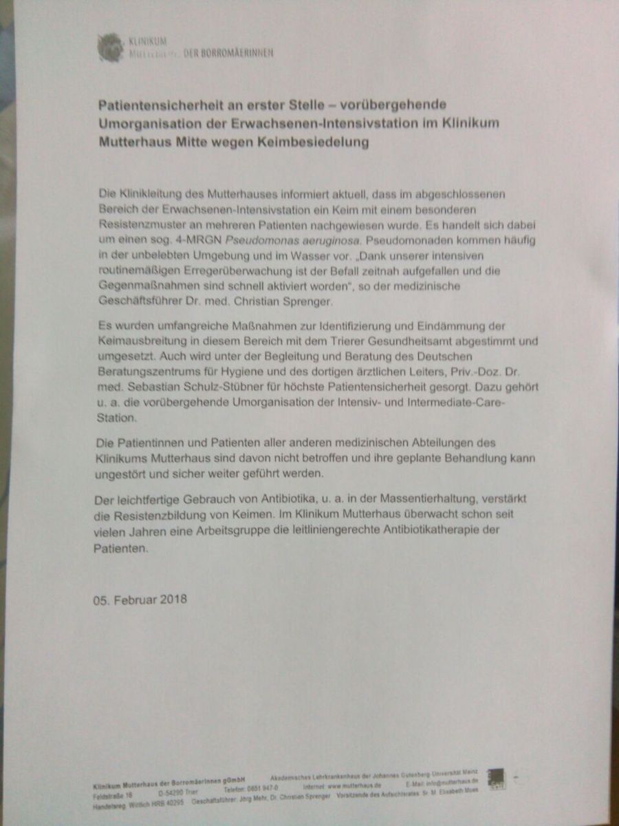 „Es wurden umfangreiche Maßnahmen zur Identifizierung und Eindämmung der Keimausbreitung in diesem Bereich mit dem Trierer Gesundheitsamt abgestimmt und umgesetzt“, heisst es in einem Info-Blatt, welches den Patienten ausgeteilt wurde.