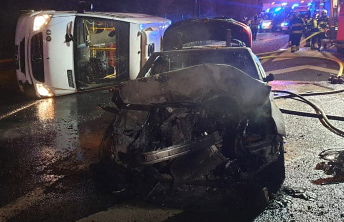 Aufgrund der Wucht des Aufpralls wurde der Bus gegen die Leitplanken gedrückt, worauf das Gefährt auf die Fahrerseite kippte. Der Wagen des Unfallverursachers kam einige Meter vor dem Bus zum Stillstand und fing unmittelbar dannach Feuer. Der verletzte Fahrer flüchtete. Vier Fahrgäste aus dem Bus erlitten schwere Verletzungen, die anderen wurden leicht verletzt.