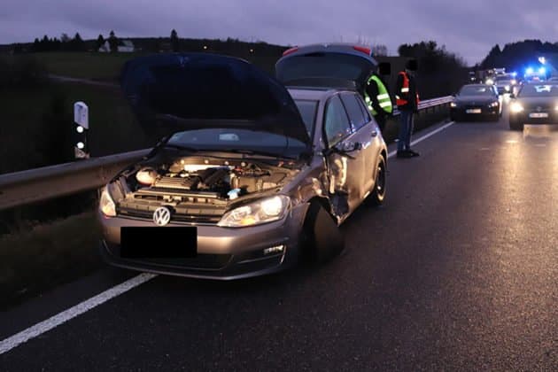 Auf der Umleitungsstrecke ereignete sich dann zeitgleich ein dritter Verkehrsunfall. Ein 26-Jähriger befuhr die L 11 von der Anschlussstelle Prüm in Richtung der B 410 bei Niederprüm. Er überfuhr aufgrund nicht angepasster Geschwindigkeit die B 410 und kam gegenüber der Einmündung von der Fahrbahn ab und in einem Acker zum Stehen. Hier entstand Sachschaden am PKW.