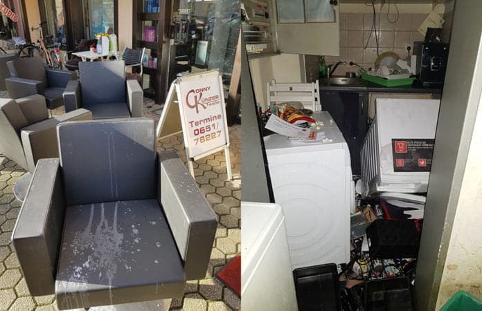 Dort entwendeten sie neben Bargeld diverse Friseurwerkzeuge. Vermutlich in der Absicht ihre Spuren zu verwischen, setzten sie das gesamte Ladenlokal durch aufdrehen mehrerer Wasserhähne unter Wasser und beschädigten das Inventar mit Chlorreiniger. Die Einbrecher versuchten weiterhin die Tür zu einer Anwaltskanzlei im gleichen Gebäude aufzubrechen.