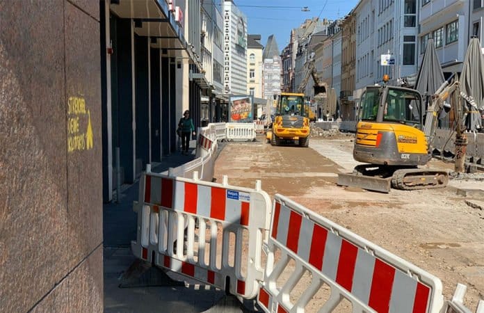 Der Infektionsschutz vor dem Corona-Virus erfordert auch für Straßenbauarbeiten besondere Vorkehrungen: Fußgänger können die Baustelle zwar passieren, die Durchgänge auf beiden Seiten sind jedoch recht schmal. Um unnötige Begegnungen zu vermeiden und den gebotenen Abstand von 1,50 Meter zu anderen Personen einzuhalten, wurde eine Einbahnstraßenregelung eingerichtet: Die Baustelle darf nur in Gehrichtung links passiert werden.