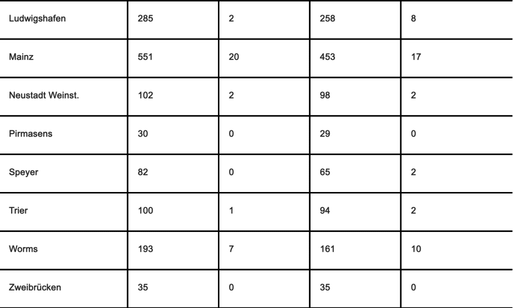 Die oben genannten Zahlen entsprechen den in der Meldesoftware des Robert Koch-Instituts übermittelten laborbestätigten Fällen einer COVID-19 Erkrankung mit Meldeadresse in Rheinland-Pfalz. Diese werden von den Gesundheitsämtern über die Landesmeldestelle beim Landesuntersuchungsamt an das Robert Koch-Institut übermittelt. Da die Mitarbeiterinnen und Mitarbeiter der Gesundheitsämter vor Ort am Wochenende und an Feiertagen in erster Linie mit der Ermittlung von Kontaktpersonen und Quarantänemaßnahmen gebunden sind, erfolgen die Meldungen zum Teil zeitverzögert.