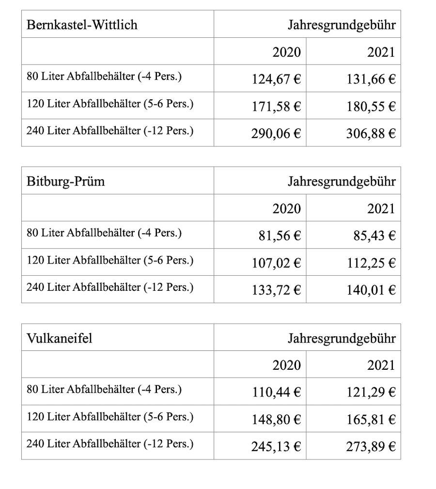 Bisher lagen die durchschnittlichen Gebühren pro Person pro Jahr zwischen 16,79 und 28,60 Euro für die regelmäßige Leerung eines 120-Liter-Restabfallbehälters. In diesen Gebühren sind außerdem die Abholung von Altpapier, die Nutzung der Sammelcontainer für Biogut und zahlreiche weitere Serviceleistungen enthalten. Künftig steigen diese Kosten um durchschnittlich 2,40 Euro pro Person pro Jahr. In Trier und Trier Saarburg ist der jährliche Mehraufwand – für einen 120 Liter Abfallbehälter – mit 4,41 € pro Person am höchsten, in Bitburg-Prüm beträgt der Unterschied lediglich 0,87 €. Aufgrund der getrennten Gebührenhaushalte und der unterschiedlichen Finanzkraft der einzelnen Gebührenhaushalte fallen die Anpassungen unterschiedlich hoch aus.