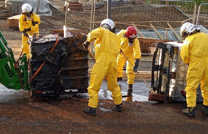 Da die Container nicht verschlossen waren lief eine große Menge Öl über die Straße in die angrenzenden Wiesen. Nur durch glückliche Umstände gelangte das Öl nicht in den Abwasserkanal.