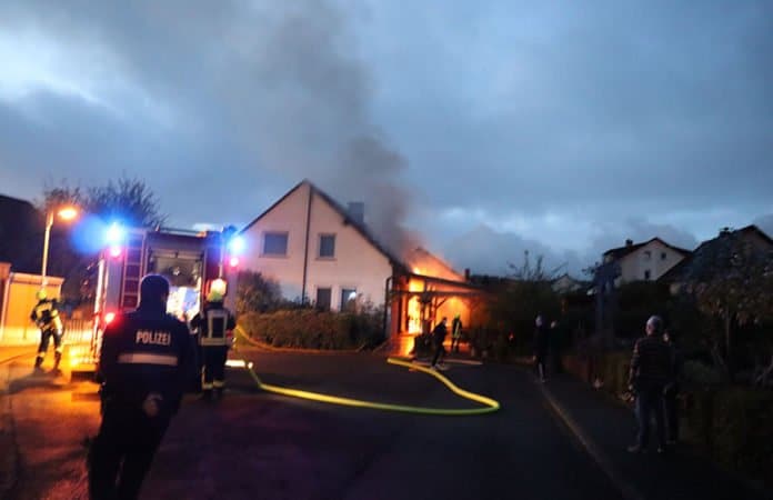 Die Flammen schlugen auf den Dachstuhl des angrenzenden Einfamilienhauses über. Die Ermittlungen zur genauen Brandursache dauern an.
