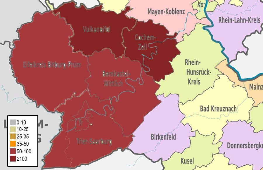 Die 7-Tage-Inzidenz liegt in der Stadt Trier nahezu unverändert bei 57,4 und ist im Landkreis im Vergleich zu gestern wieder gesunken auf aktuell 81,0 Neuinfektionen in den letzten 7 Tagen pro 100.000 Einwohnern.