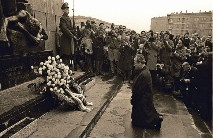 An diesem Tag hatte Brandt unmittelbar vor der Unterzeichnung des Vertrags, in dem die Bundesrepublik die polnische Westgrenze anerkannte, am Denkmal für die Helden des jüdischen Ghettos in Warschau einen Kranz niedergelegt. Nach dem Zurechtrücken der Kranzschleifen fiel der SPD-Politiker auf die Knie. Die Geste fand weltweit Beachtung als Bitte um Vergebung für die Verbrechen der Nazizeit und als Zeichen für Versöhnung. (dpa)