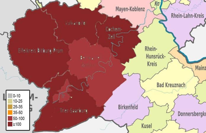 Insgesamt gab es im Landkreis Vulkaneifel in den letzten 7 Tagen 71 bestätigte Neuinfektionen. Der 7-Tage-Inzidenz (Fälle der letzten 7 Tage/ 100.000 Einwohner) im Landkreis Vulkaneifel liegt somit aktuell bei 117,1.