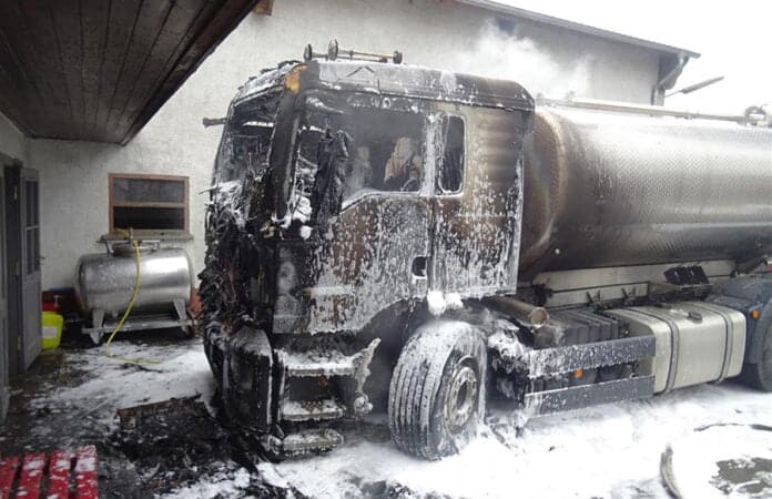 Während des Befüllens des Milchtanklastwagens bemerkt der Fahrer ein Feuer im Bereich des Motors der Zugmaschine, welches schnell auf die Zugmaschine übergreift. Der Milchtanklastwagen wird hierbei stark beschädigt. Der Lastkraftwagen war zum Befüllen neben einem Anwesen abgestellt.