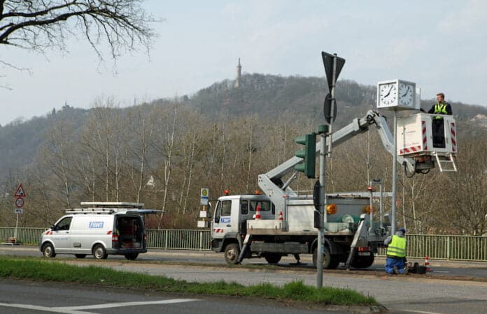 Den neuen Standort haben die SWT in Abstimmung mit der Stadt bewusst gewählt, um bei künftigen Wartungsarbeiten an der Uhr nicht die komplette Fahrbahn zu blockieren.