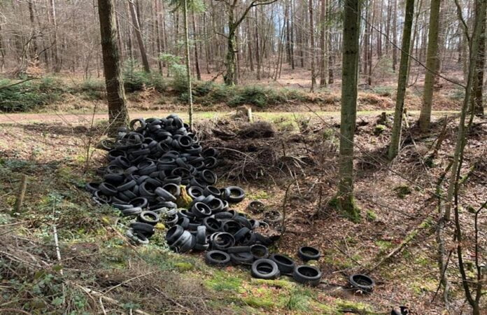 Wie die Polizei mitteilt, wurden in der Nacht von Samstag, 10. April, auf Sonntag, 11. April, neben einem Waldweg im Staatswald bei Erlenbach, Gemarkung Hetzerath ca. 100-200 Reifen unerlaubter weise abgekippt.