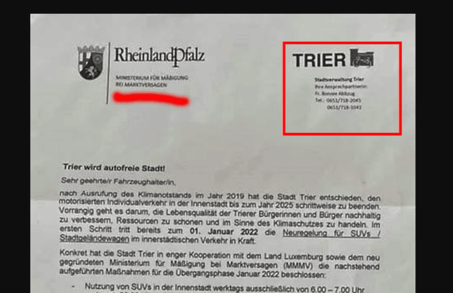 Das Schreiben hat einen offiziell aussehenden Briefkopf mit dem Landeswappen von Rheinland-Pfalz sowie einem leicht verfremdeten Trierer Stadtlogo und kommt von einem angeblichen „Ministerium für Mäßigung bei Marktversagen“. Es geht darin um angebliche Einschränkungen für das Fahren von SUVs in der Stadt Trier. In dem Schreiben sind tatsächlich existierende Telefonnummern der Stadtverwaltung für Rückfragen angegeben.