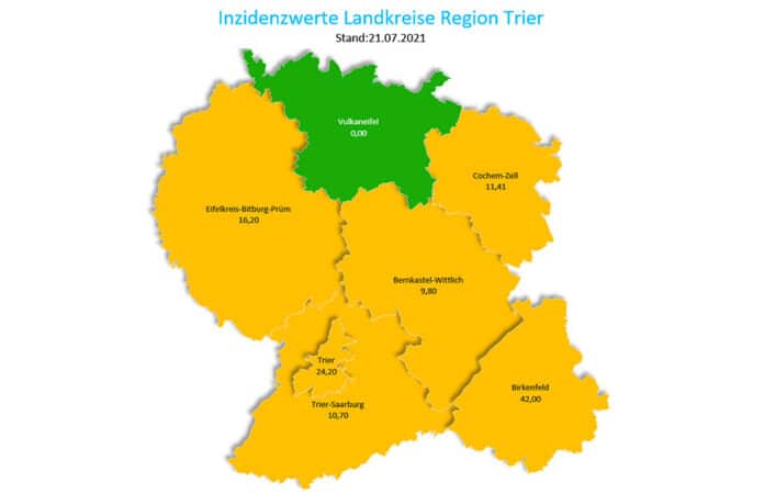 TRIER. Die aktuellen Corona-Zahlen von Mittwoch, 21. Juli, aus dem Landkreis Trier-Saarburg, dem Eifelkreis, dem Vulkaneifelkreis, Landkreis Bernkastel-Wittlich, dem Landkreis Cochem-Zell sowie der Stadt Trier.