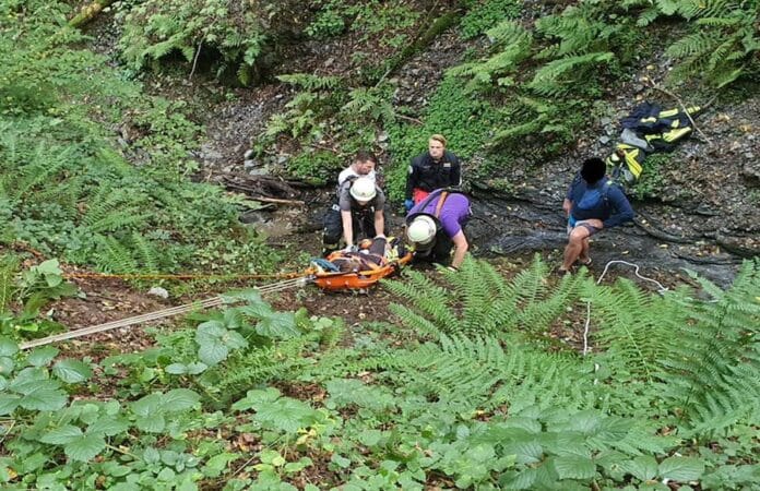 Hier kam eine Person mit dem Fahrrad von einem Wanderweg ab und stürzte eine ca. 10 Meter tiefe Schlucht hinunter. Da sie aufgrund ihrer Verletzungen nicht selbst aus der steilen Schlucht klettern konnte, wurde die Frau nach der medizinischen Erstversorgung mit einer Schleifkorbtrage den Abhang hoch gezogen.
