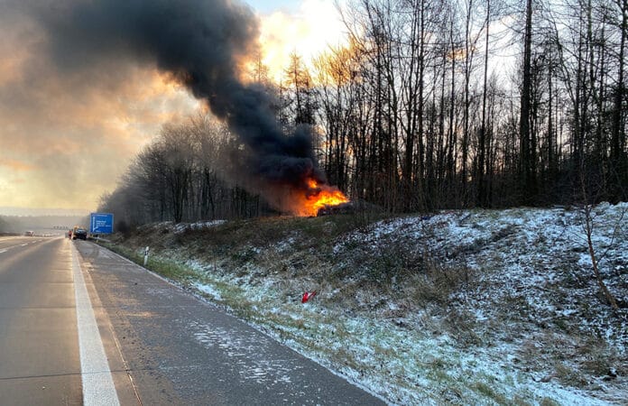 Einen besonderen Schutzengel hatte ein 25-Jähriger PKW-Fahrer. Infolge nicht angepasster Geschwindigkeit und Schneeglätte, kam er kurz vor der Anschlussstelle Enkenbach nach links von der Fahrbahn ab. Der PKW schlug zunächst in die Mittelschutzplanken ein und schleuderte anschließend eine angrenzende Böschung hinauf. Dort wurden 100 Meter Wildschutzzaun niedergemäht. Danach blieb der PKW auf der Böschung stehen. Unmittelbar nachdem sich der Fahrer aus seinem Fahrzeug befreit hatte, fing der PKW Feuer.