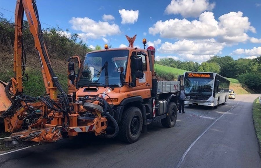 WIESBACH. Ein Mähfahrzeug ist auf einer Landstraße in der Südwestpfalz beim Rückwärtsfahren gegen einen Linienbus gestoßen.