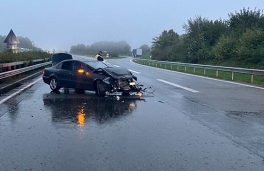 In Höhe des Parkplatzes Kornfeld verlor er auf regennasser Fahrbahn die Kontrolle über sein Fahrzeug und kollidierte frontal mit der Leitplanke.