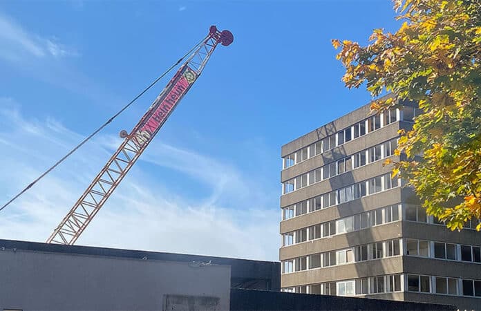 Zunächst werden die Fassadenplatten abgehängt und die darunter befindlichen Schadstoffe entfernt. Anschließend wird ein Greifer am Seilbagger das Hochhaus geschossweise „zurückbauen“. Entstehender Staub soll dabei mit Wasser gebunden werden, um die Auswirkungen auf die Nachbarschaft möglichst gering zu halten. Auch die Lärmbelastung am Standort war bisher für eine Abrissmaßnahme dieser Größenordnung gering, denn das entstehende Abbruchmaterial wird zum Reycling nicht vor Ort zerkleinert, sondern auf das Gelände des künftigen Gewerbe-Quartiers parQ54 (ehemalige General-von-Seidel-Kaserne) transportiert und dort gebrochen.