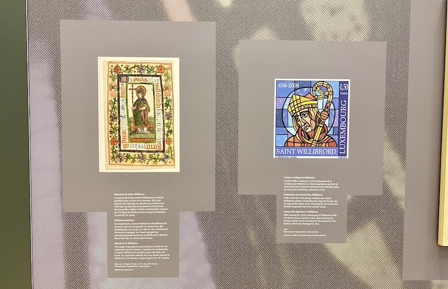 Die Ausstellung zeige auf, dass das Bild mittelalterlicher Persönlichkeiten, die zu Kristallisationspunkten von Identität wurden, nicht statisch, sondern fluide ist, erläuterte Summer weiter. Anhand von Büchern, Stichen, Urkunden und weiteren Objekten mit Erläuterungen auf Luxemburgisch, Französisch und Deutsch führt die Ausstellung den Besucher durch drei Etappen der Willibrord-Rezeption im 19. und 20. Jahrhundert: Den Anfang macht die Zeit von der französischen Besatzung in der Revolutionszeit, als die Springprozession verboten wurde und die Basilika in der Folge nach und nach verfiel, bis dann 1861 der Willibrordus-Bauverein gegründet wurde, der durch starkes Engagement der Echternacher Bürger die Basilika bis zum Jahre 1868 wiederherstellen konnte. Es folgte eine neue Blüte der Willibrord-Verehrung, bei der bis zu 15.000 Menschen an der Springprozession teilnahmen.