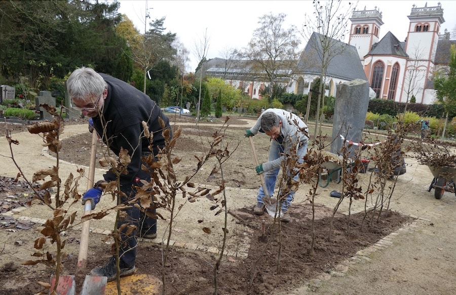 Der Trostgarten auf dem Friedhof St. Matthias nimmt langsam Gestalt an, wie die Pfarrei St. Matthias mitteilt. Nach Abschluss der Bauarbeiten geht es jetzt ans Bepflanzen. Die Hecken des Trostgartens werden von Ehrenamtlichen gepflanzt: „Um Kosten zu sparen“.