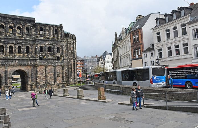 Zum einen geht es um die Verlegung der Bushaltestellen an den Simeonstiftplatz, zum anderen um die Umsetzung der Ergebnisse des Gestaltungswettbewerbs „Umfeld Porta Nigra“ aus dem Jahr 2010. Zum Thema Busverkehr liegt jetzt eine Machbarkeitsstudie vor, die bestätigt, dass am Simeonstiftplatz ausreichend Platz vorhanden ist, um den ÖPNV in beiden Fahrtrichtungen abzuwickeln. Bisher fahren nur die Busse in Richtung Süden über diesen Platz. Nach Trier-Nord und zum Hauptbahnhof fahren sie über das Margaretengässchen und die Simeonstraße und damit direkt an der Porta vorbei.