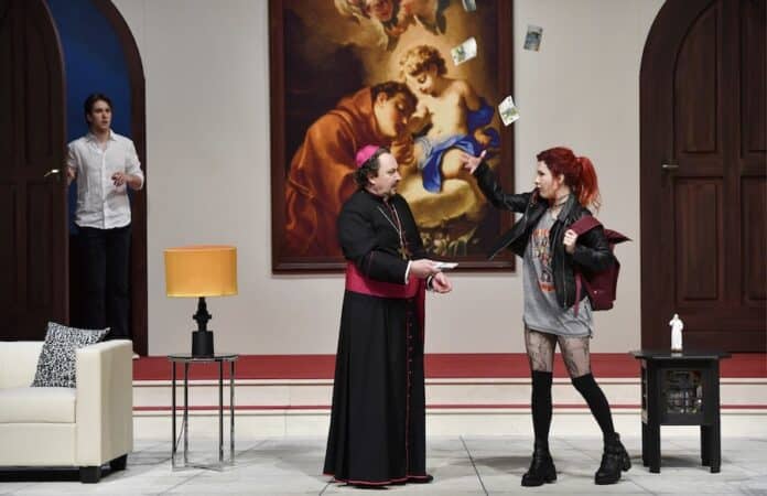 TRIER. Nach zwei vorausgegangenen Previews fand am gestrigen Samstagabend im Großen Haus des Theaters Trier die Premiere und Uraufführung von „Kardinalfehler“ statt, einer satirischen Komödie über den Machtmissbrauch in der katholischen Kirche, die auch auf die Verhältnisse in Trier Bezug nimmt. Intendant und Regisseur Manfred Langner hatte das Stück bei dem Autorenduo Dietmar Jacobs und Alistair Beaton in Auftrag gegeben. Das Ergebnis ist ein hochaktuelles Stück, das ein heißes Eisen anfasst und es erstaunlich gut vermag, Komik und Tragik miteinander zu verknüpfen.