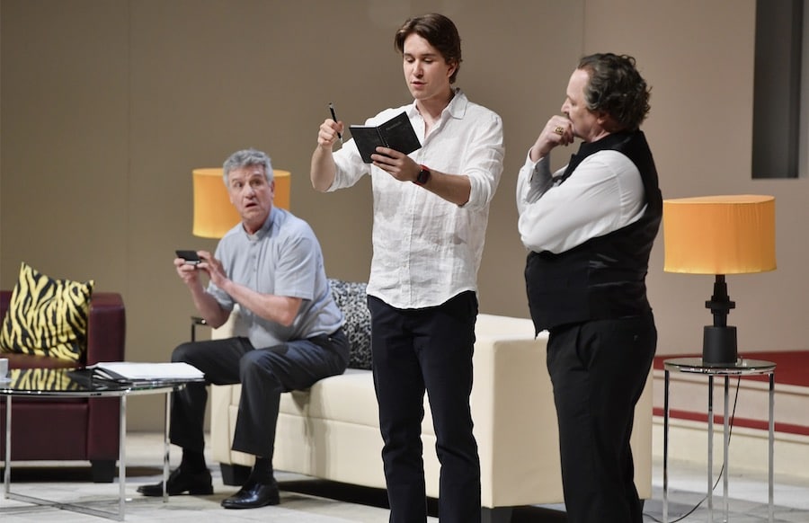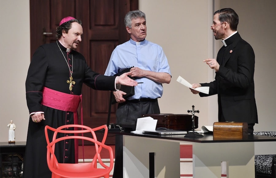 Wie gut, dass Glöckner, der in der Premiere und Uraufführung der Kirchensatire „Kardinalfehler“, die am gestrigen Abend im großen Haus des Theaters Trier stattfand, von Michael Hiller gespielt wird, in dem umtriebigen Generalvikar Helmut Koch (Michael Ophelders) einen Strippenzieher an seiner Seite hat, der schon optisch durch seine Kleidung als „graue Eminenz“ gekennzeichnet ist. Koch ist sowohl der Mann fürs feine Detail – für den Papst hat er eigens dessen bevorzugte Seife mit Zitrusaromen aus Sevilla besorgt – wie auch fürs Grobe: Raunend erinnert er den Bischof an den Wert seiner Dienste mit dem Hinweis, „ in der Vergangenheit viele Kleinigkeiten wegorganisiert“ zu haben. Dass das mit dem „Wegorganisieren“ so seine Tücken hat – und die „Kleinigkeiten“ vielleicht doch etwas größere Dimensionen haben als gedacht – wird im Laufe dieses Theaterabends indes immer offensichtlicher.