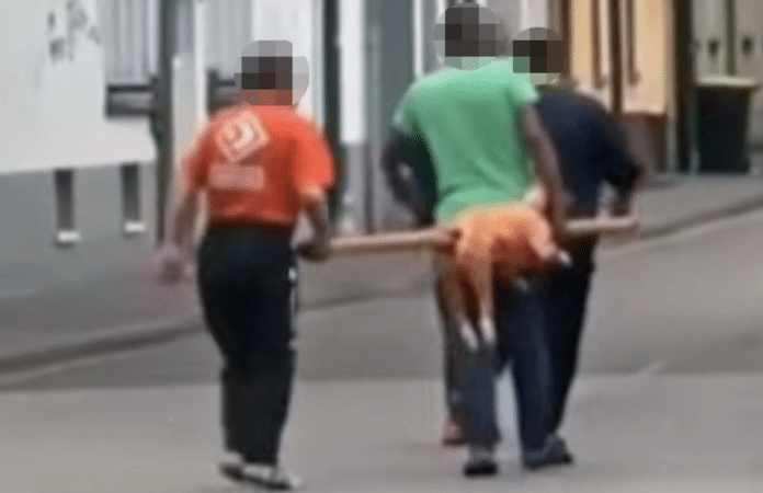 NEUNKIRCHEN. Was war denn da in Neunkirchen los? Derzeit sorgen Videos – aufgenommen von Passanten in Neunkirchen – im Netz für Wirbel und Spekulationen. Zu sehen: Vier Männer, welche durch die Neunkirchner Innenstadt laufen und auf einer Holzstange ein aufgespießtes Trier tragen.