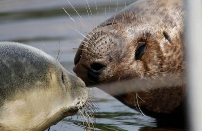 Ein Seehundwelpe liegt einen Tag nach seiner Geburt neben einem Muttertier. Foto: Wolfgang Runge/dpa/Symbolbild