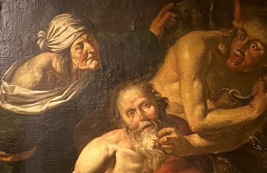 Da ist zum Beispiel der „Hiob mit Frau und Teufel“ des Flamen Hendrik de Somer, der fast ausschließlich in Italien wirkte. De Somer war über seinen Lehrer Jusepe de Ribera ein Enkelschüler Caravaggios, was sich im gezeigten Gemälde an den ausgeprägten Hell-Dunkel-Kontrasten des Chiaroscuro zeigt, die auf Caravaggio zurückgehen und die für den Barock im Allgemeinen stilbildend wurden.
