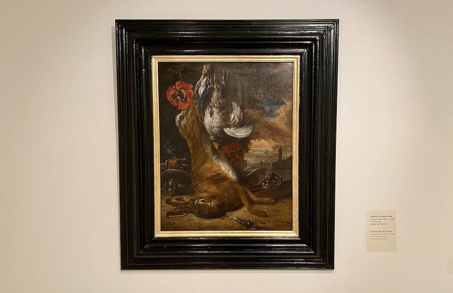 Als einziges Gemälde ohne biblischen Bezug hat das „Stilleben mit totem Hase“ des Niederländers Jan Baptist Weenix eine gewisse Sonderstellung. Das Motiv könne als Memento mori verstanden werden, so Hoppe, es könne aber auch als Trophäenbild gedeutet werden, das auf das adlige Privileg der Jagd Bezug nehme und so der Repräsentation des Auftraggebers diene. Gerade die Kombination eines erlegten Hasen mit einem erlegten Vogel sei im Barock äußerst beliebt gewesen. Die Landschaft, in die das Gemälde sich im Hintergrund öffnet, könnte die Jagdgründe darstellen.