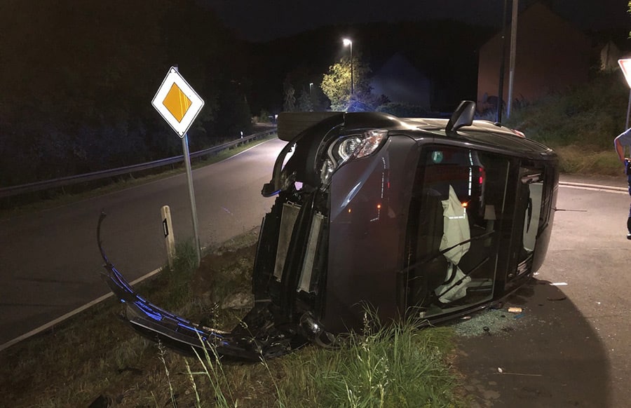 Das Fahrzeug wurde durch das Überfahren des Steins auf die Seite geworfen und kam auf der linken Fahrzeugseite zum Liegen.