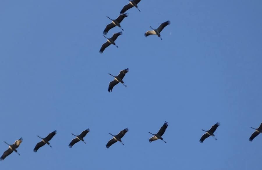 Ob der Klimawandel Einfluss auf den Rhythmus der Kraniche hat, darüber ist man sich – anders als bei anderen Vögeln – nicht einig. Zwar haben sich die Zeiten leicht verschoben, doch die Ursache bleibt unklar. Die größten Rastplätze der Kraniche liegen im Übrigen in den nordöstlichen Bundesländern, also im Berliner Umland, in Brandenburg und in Niedersachsen. Dort sind teils mehr als 50.000 Tiere an einer Stelle zu beobachten. (Quelle: SGD Nord)