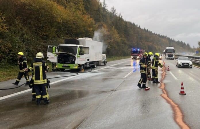 Durch die Hilfe von zwei weiteren LKW-Fahrern wurde dieser Brand mittels Feuerlöschern bekämpft und durch die kurz darauf eintreffende Feuerwehr komplett abgelöscht. Dadurch konnte ein Vollbrand und Übergreifen auf die Ladung verhindert werden. Brandursächlich dürfte ein technischer Defekt im Motorraum gewesen sein.