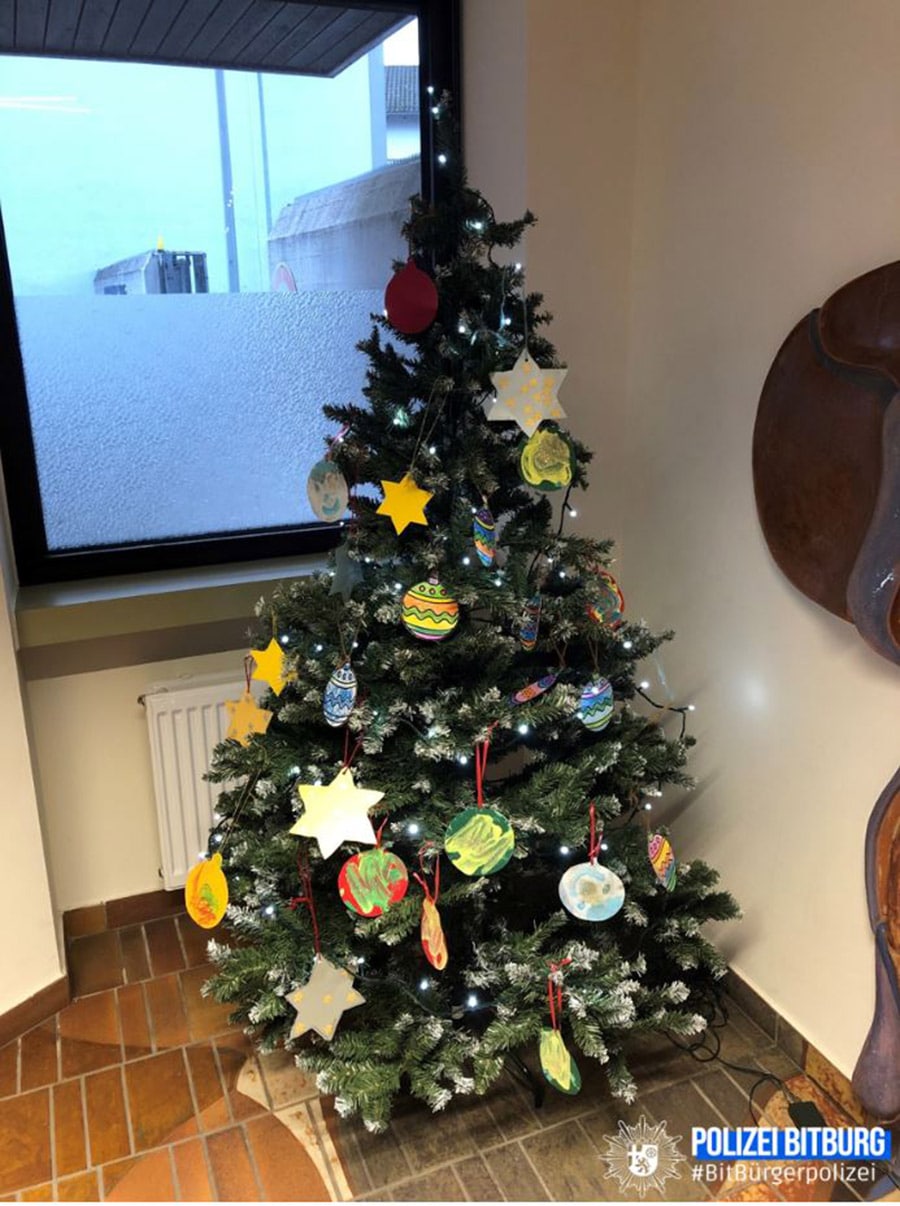 Die Polizei Bitburg wünscht allen Bürgerinnen und Bürgern eine gute Vorweihnachtszeit und ein fröhliches Fest. Sie wird auch während der Feiertage rund um die Uhr die Sicherheit für alle Menschen gewährleisten. Darüber hinaus bedankt sie sich recht herzlich bei den kleinen Weihnachtsheferinnen und -helfern und freut sich über die weihnachtliche Stimmung, die der Baum jetzt verbreitet.