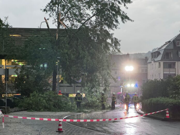 Im Rautenstrauchpark nahe der Treviris-Passage sei ein Baum bei einem Blitzeinschlag gespalten worden – Menschen seien nicht verletzt worden. Zudem seien an verschiedenen Stellen Autos durch umherfliegende Gegenstände und herabfallende Äste beschädigt worden. An einigen Kreuzungen fielen den Angaben nach die Ampeln aus.