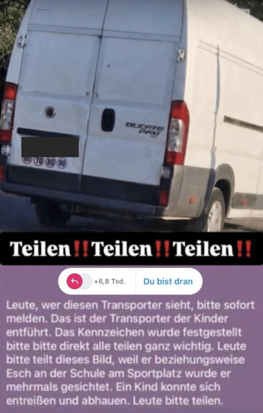 ESCH/TRIER. Ende der vergangenen Woche kursierte in Social Media und über WhatsApp ein Foto eines Transporters aus Esch, das für Unruhe bei vielen Eltern sorgte. Das Bild, das auch lokalo.de zugespielt wurde, wurde mit einer Warnung verbreitet, dass aus diesem Fahrzeug heraus ein Kinderansprecher in Esch unterwegs sei und in einem Fall sich bereits ein Kind „entreißen“ konnte. Eltern reagierten besorgt, und die Meldung verbreitete sich rasch, ohne dass wohl zunächst eine Überprüfung der Fakten erfolgte.