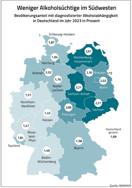 Besonders oft waren Menschen aus dem Saarland in der zweiten Lebenshälfte von Alkoholsucht betroffen. So entfiel rund jede vierte Alkoholsucht-Diagnose allein auf die saarländischen 55- bis 64-Jährigen. Das entspricht im Jahr 2023 rund 3.000 Männern und 1.500 Frauen aus dem Bundesland in dieser Altersgruppe. Der Anteil alkoholkranker Menschen im Saarland an der Gesamtbevölkerung lag im gleichen Jahr laut Barmer bei 1,64 Prozent (Bund: 1,69 Prozent). Den geringsten ärztlich erfassten Alkoholikeranteil wies Hessen auf (1,45 Prozent), den höchsten Mecklenburg-Vorpommern (2,61 Prozent). „Weil sich Alkoholabhängigkeit schleichend entwickelt und eine Alkoholsucht lange versteckt werden kann, vergehen bei Betroffenen nicht selten zehn Jahre von den ersten Krankheitszeichen bis zum Alkoholentzug“, erklärt Kleis. Wer glaube, ein Alkoholproblem zu haben, solle am besten zunächst ärztlichen Rat suchen oder zu einer Suchtberatung gehen und dort offen über den eigenen Alkoholmissbrauch sprechen. (Quelle: Barmer Rheinland-Pfalz/Saarland)